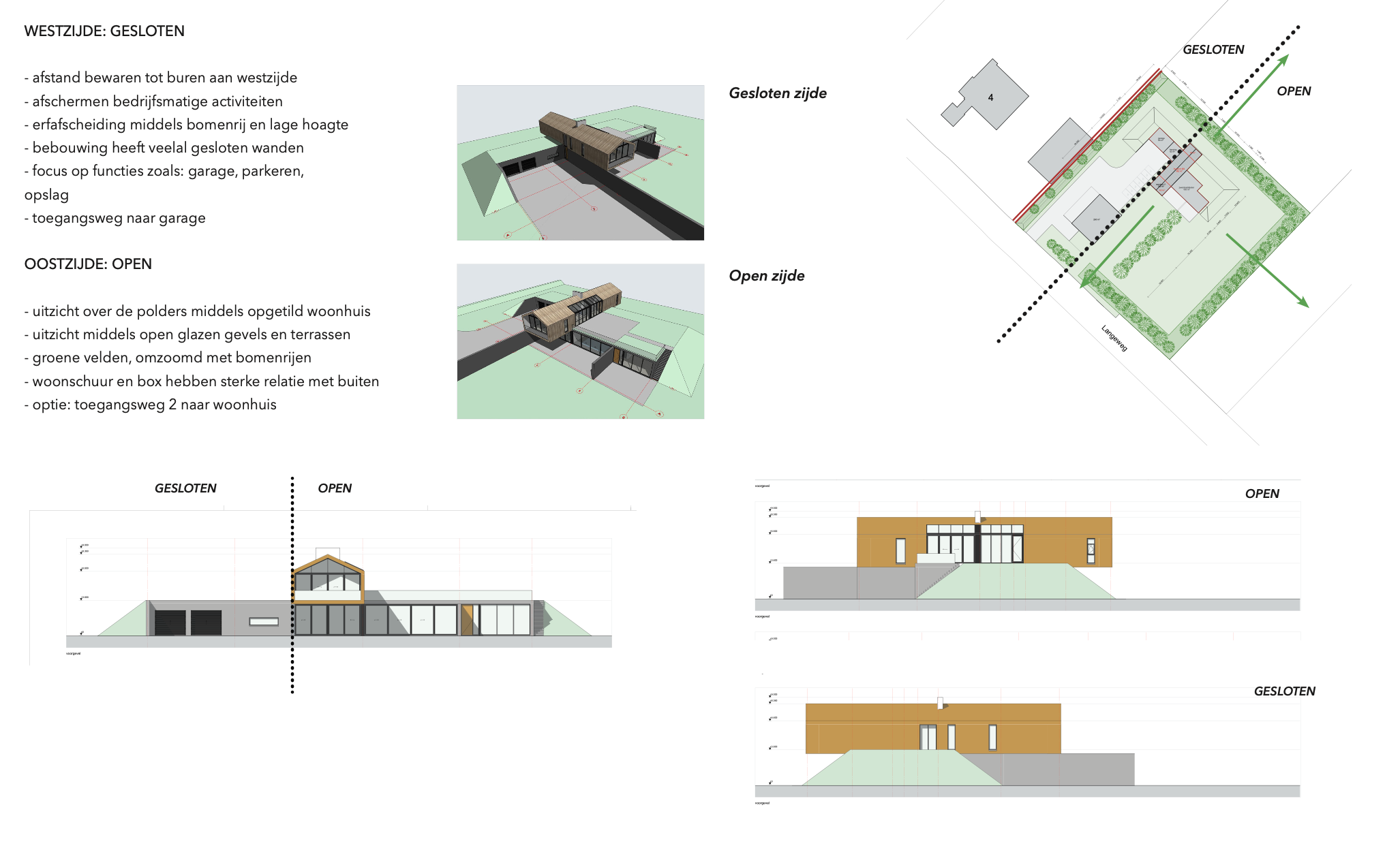 De woning dient een combinatie te worden van een moderne villabox en een traditionele schuurwoning, gebruikmakend van natuurlijke materialen. Daarnaast is het van belang om zorg te dragen voor een weids uitzicht over de polder, met mooie vergezichten en doorkijkjes.