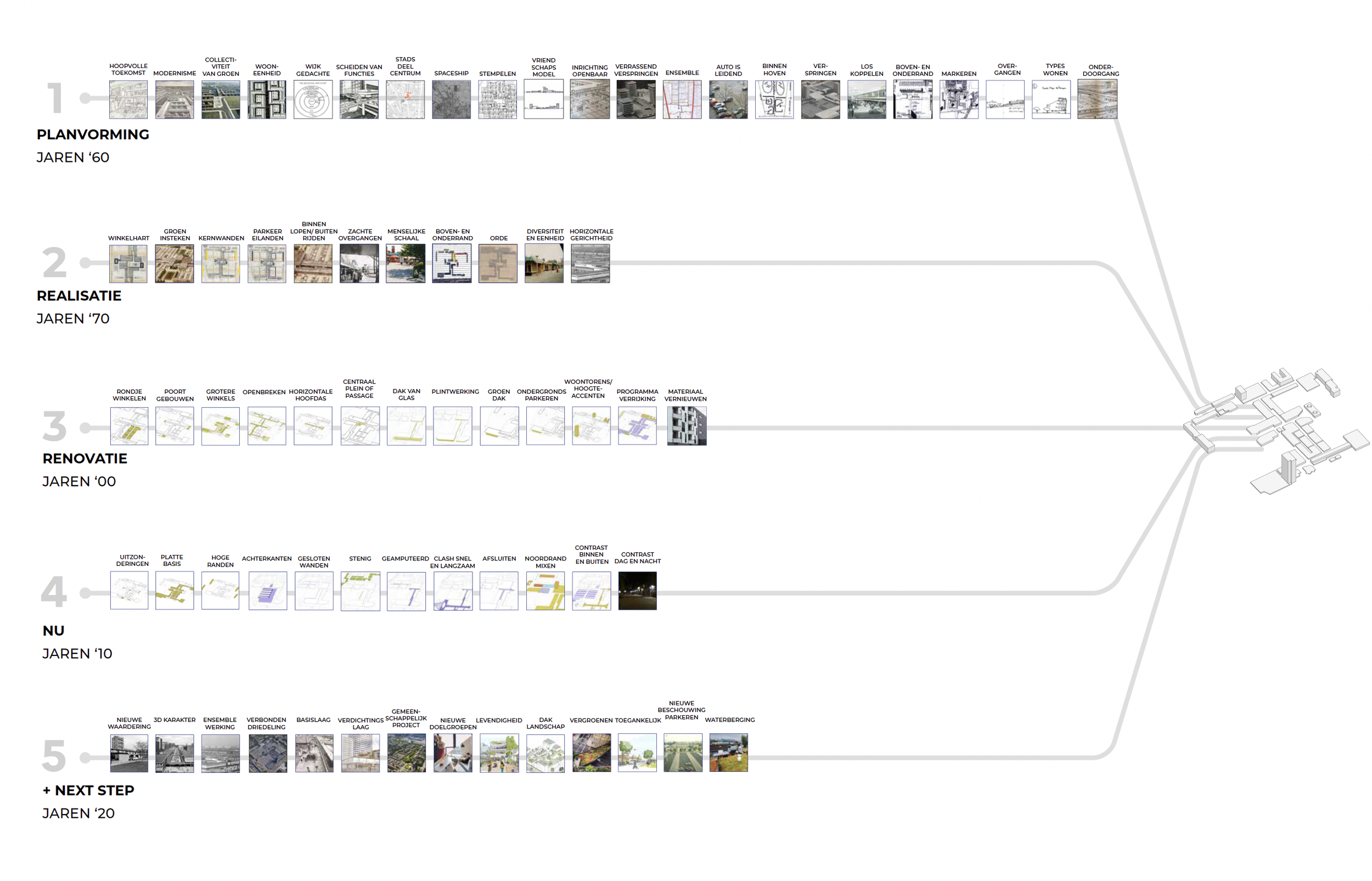 De locatie van het winkelcentrum werd onderzocht aan de hand van vijf verschillende fases in de ontwikkeling: de planvorming in de jaren 60, de realisatie in de jaren 70, de renovatie vanaf 2000, de huidige situatie en de trends voor de toekomst. Hierbij gaan we op zoek naar het gedachtegoed en de kenmerkende eigenschappen van het WCW in die specifieke periodes.